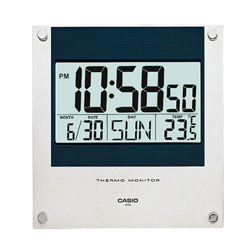 Casio 11S-2DF/11S-1DF Digital Wall Clock: Resin case, Thermometer range: -19.9 to 49.9 °C (-3.8 to 121.8 °F), Measuring unit: 0.1°C, Temperature sensor precision: ±2 °C (±4 °F) from 0 to 40 °C (32 to 104 °F), Celsius/Fahrenheit change, Auto-calendar (up to 2099), 12/24-hour format, Accuracy: ±60 seconds/month, Battery life: 12 months (R6P X 2), Case size: 236×221×25mm, Weight: 460g.